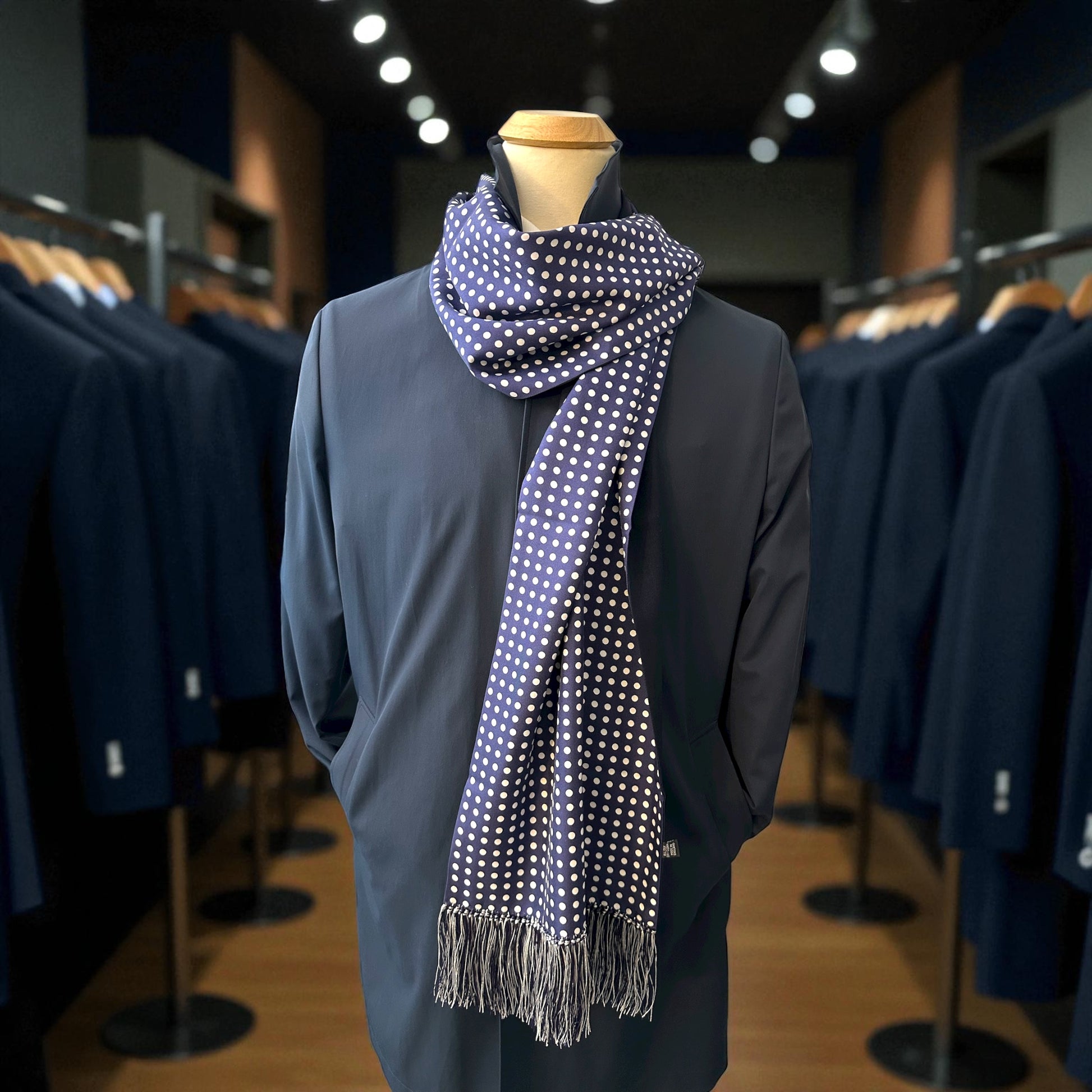 Elevate your accessory collection with this sophisticated reversible scarf, crafted from pure silk twill on one side and luxurious merino wool on the other. The navy base features elegant white polka dots, while hand-knotted silk fringes in coordinating navy and white add refined detail. Measuring 12.5 inches wide by 70 inches long, this versatile piece transitions seamlessly between seasons and occasions. Flip it to reveal the merino wool side for added warmth and texture. Complete your coordinated look with the matching tie and pocket square, available separately. A timeless investment in quality craftsmanship.
